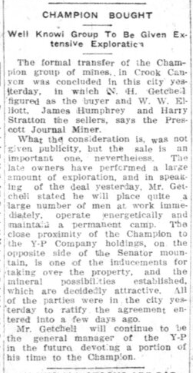 The only other mention of Harry Stratton in the news came a year later, when he and his business partners sold the Champion Gold Mining Company to a team of British investors. I haven’t been able to track down the exact location of the mine, but articles point to Crooks Canyon, 12 miles south of Prescott.